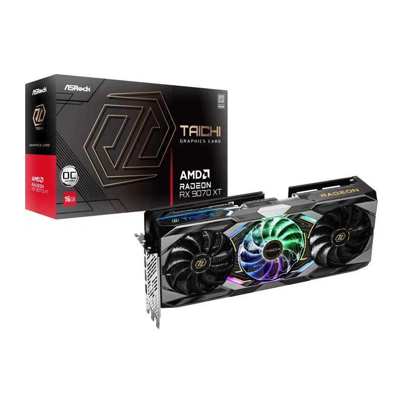 Asrock Taichi Radeon RX 9070 XT OC. Processore grafico / fornitore: AMD, Processore grafico: Radeon RX 9070 XT. Memoria Grafica Dedicata: 16 GB, Tipo memoria adattatore grafico: GDDR6, Ampiezza dati: 256 bit. Risoluzione massima: 7680 x 4320 Pixel. Versione DirectX: 12 Ultimate, Versione OpenGL: 4.6. Tipo interfaccia: PCI Express x16 5.0. Tipo di raffreddamento: Attivo, Numero di ventole: 3 ventola(e), colore d'illuminazione: Multi
